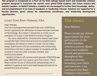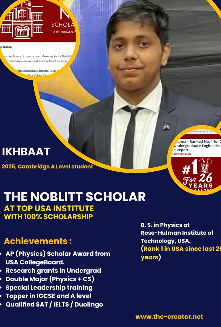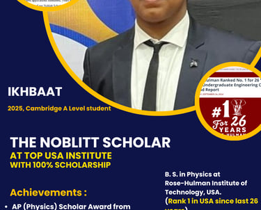 Studying undergrad B. S. (Physics) at USA top institution Rose-Hulman Institute of Technology as an elite student, the Noblitt Scholar.