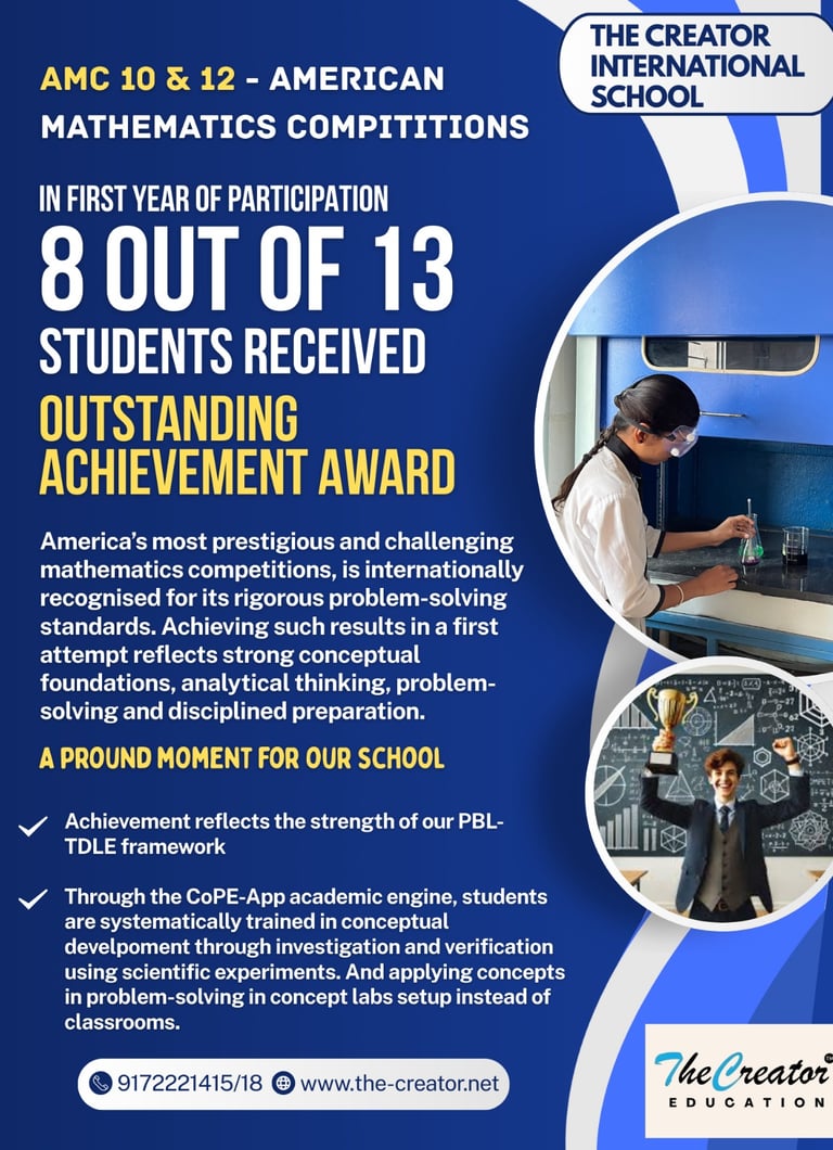 The Creator International School, a STEM school, is dedicated to advancing fundamental sciences — Physics, Chemistry, Biology — and Mathematics as powerful pathways to knowledge & wealth creation for overall growth. By nurturing curiosity, creativity, and a spirit of exploration using experiments and problem-solving, the school inspires the next generation of innovative thinkers, problem-solvers, and research entrepreneurs. Through hands-on demonstrations, experiments, and problem-based learning, students are empowered to connect classroom learning with real-world scientific inquiry — preparing them to contribute to state-of-the-art research at global research universities and institutions. With a strong foundation in the sciences at school level, our students are equipped to drive future discoveries, innovations, and patents that lead to sustainable national and global prosperity.