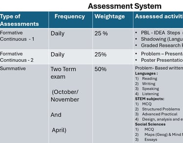 The school employs a combination of formative and summative assessments to provide a balanced evaluation of students' progress. Formative assessments are conducted regularly to track ongoing learning and provide feedback, while summative assessments at the end of each term offer a thorough understanding of students’ knowledge and application skills.Curriculum-Aligned Evaluations: