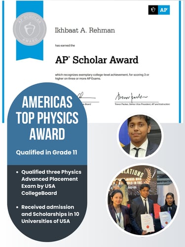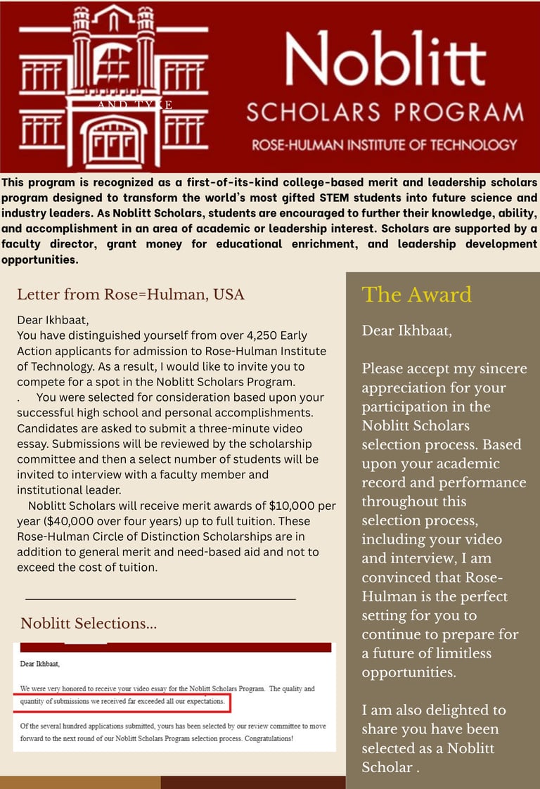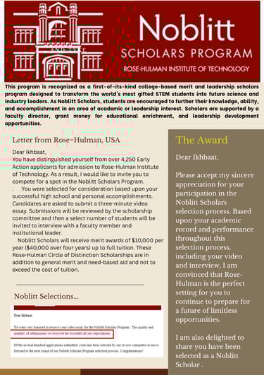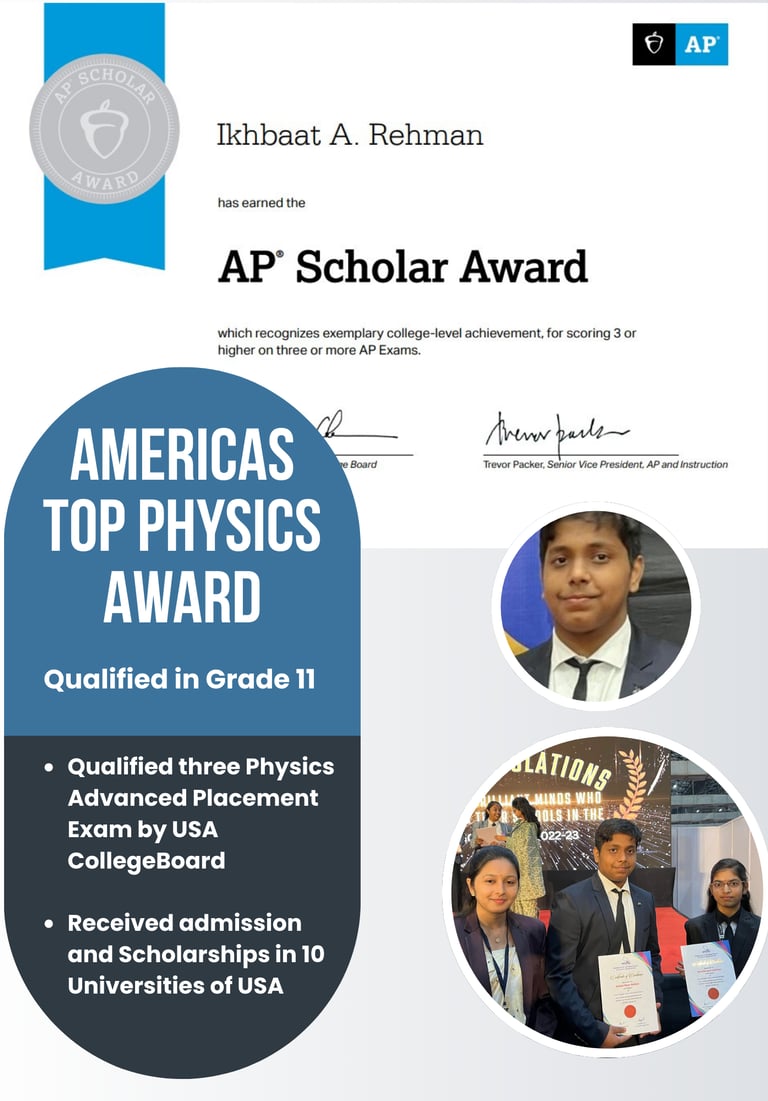 Our student’s achievement of the AP Scholar Award and recognition through the prestigious Noblitt Scholars Program at Rose-Hulman Institute of Technology reflect exceptional academic excellence at an international level. Qualifying multiple AP Physics examinations in Grade 11 and receiving admission offers with scholarships from top universities in the USA demonstrate strong conceptual depth, analytical thinking, and research-oriented preparation.