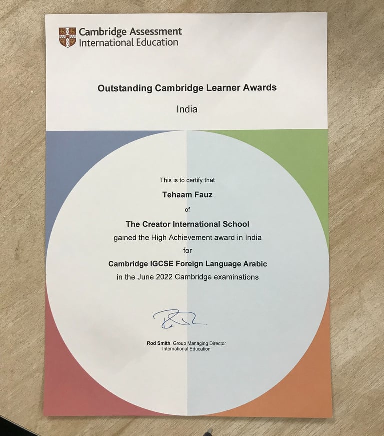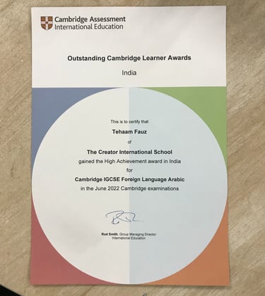 Our school is proud to announce that one of our students (Tahaam Fauz) has received the prestigious Outstanding Cambridge Learners Award in the Cambridge IGCSE (10th board) for the academic year 2021-22. This recognition is a testament to the dedication and hard work exhibited by our student, as well as the exceptional teaching and support provided by our faculty. The Cambridge IGCSE program is known for its rigorous curriculum and high standards, and this award showcases the exceptional academic achievement of our student. We congratulate our student on this remarkable accomplishment and commend them for their commitment to excellence. This recognition not only brings honor to our school but also serves as inspiration for other students to strive for academic excellence.