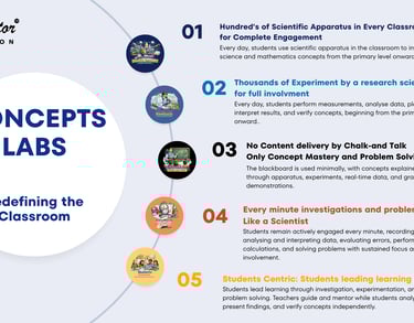 Concept Labs are innovative, research-oriented classrooms where concepts are taught through demonstrations, experiments, and real-time investigations instead of passive content delivery. Equipped with hundreds of global-standard scientific apparatus and thousands of specially designed experiments, these labs enable students to investigate and verify concepts in Physics, Chemistry, Biology, and Mathematics from the primary level onward through hands-on engagement.