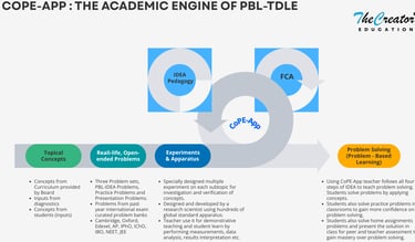 CoPE-App is an advanced digital lesson planning and academic execution platform developed exclusively for The Creator PBL-TDLE framework. It functions as a tailor-made lesson planning system based on the conceptual understanding of the whole cohort, integrating curriculum concepts, problem banks, experiments, apparatus, IDEA pedagogy, diagnostics, and assessments into one unified academic engine designed for assured concept mastery.