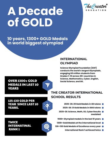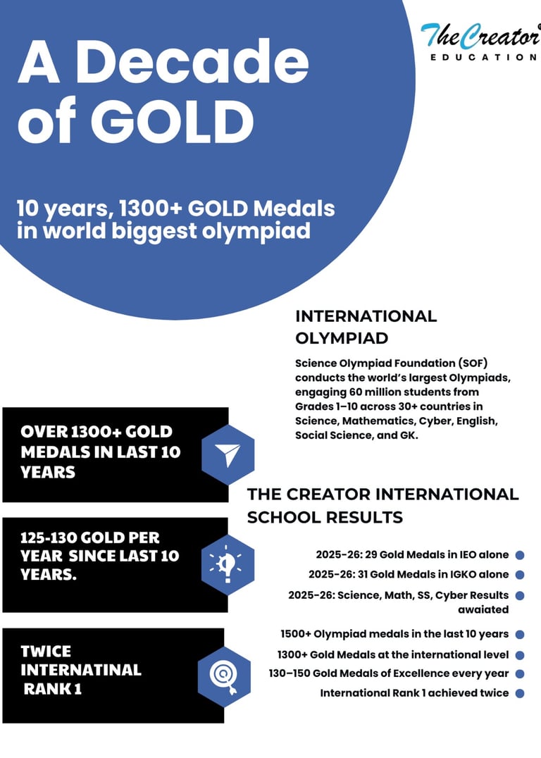 Over the past decade, our school has built a remarkable legacy of excellence with 1300+ international gold medals and consistent high performance in the world’s largest Olympiad competitions involving millions of students across 30+ countries. Achieving 125–150 gold medals annually and securing International Rank 1 twice reflects a strong culture of deep conceptual learning, disciplined preparation, and research-oriented education.