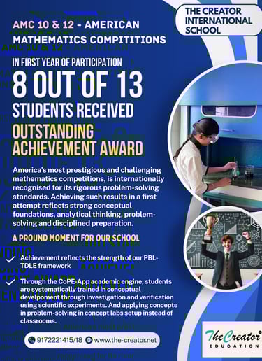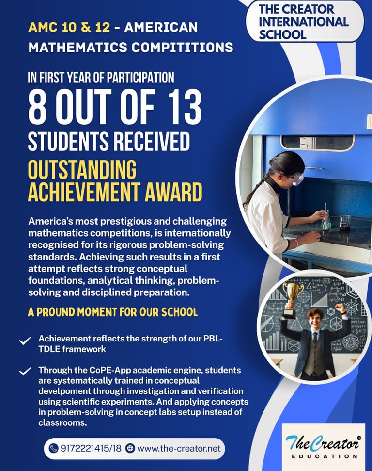 In our very first year of participation in AMC 10 and 12, a remarkable 8 out of 13 students received the Outstanding Achievement Award, reflecting strong conceptual foundations and advanced problem-solving abilities. This cohort-level performance highlights the effectiveness of our PBL-TDLE framework, where students are trained through investigation, concept verification, experiments, and structured problem solving in Concept Labs rather than traditional rote learning classrooms.