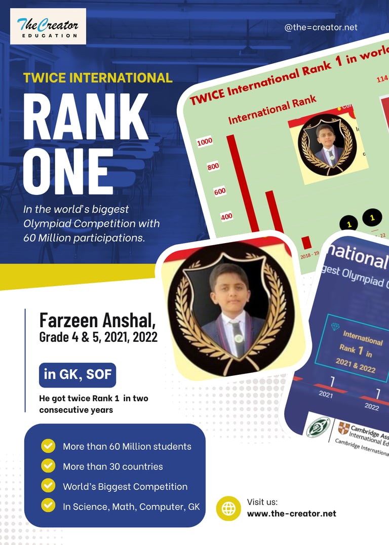 Our student has achieved an incredible feat by securing the top position twice in the world's largest Olympiad, which is conducted in over 40 countries. This prestigious competition attracts over 60 million students from around the globe. This remarkable accomplishment demonstrates our student's exceptional skills and abilities, setting them apart from their counterparts worldwide. It is a testament to their hard work, dedication, and relentless pursuit of excellence. Such an achievement not only brings great pride to our educational institution but also serves as an inspiration to aspiring students. We congratulate our student for this outstanding accomplishment and look forward to witnessing their continued success in the future.