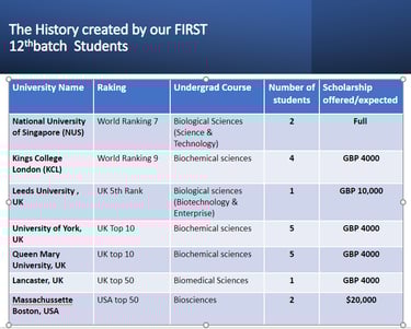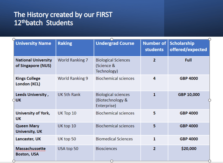 All of our first 12th batch students have been selected to the top universities in the world, including the National University of Singapore (ranked 7th globally and the best in Asia), King's College London (ranked 9th worldwide), the University of Leeds, the University of York, the University of Lancaster, and the University of Queen Mary, London. These prestigious universities have recognized the exceptional talent and hard work of our students, offering them the opportunity to pursue their higher education with scholarships. We are immensely proud of the achievements of our students and believe that their success is a testament to the quality of education and guidance they have received during their time with us. Congratulations to all the students for their well-deserved accomplishments!
